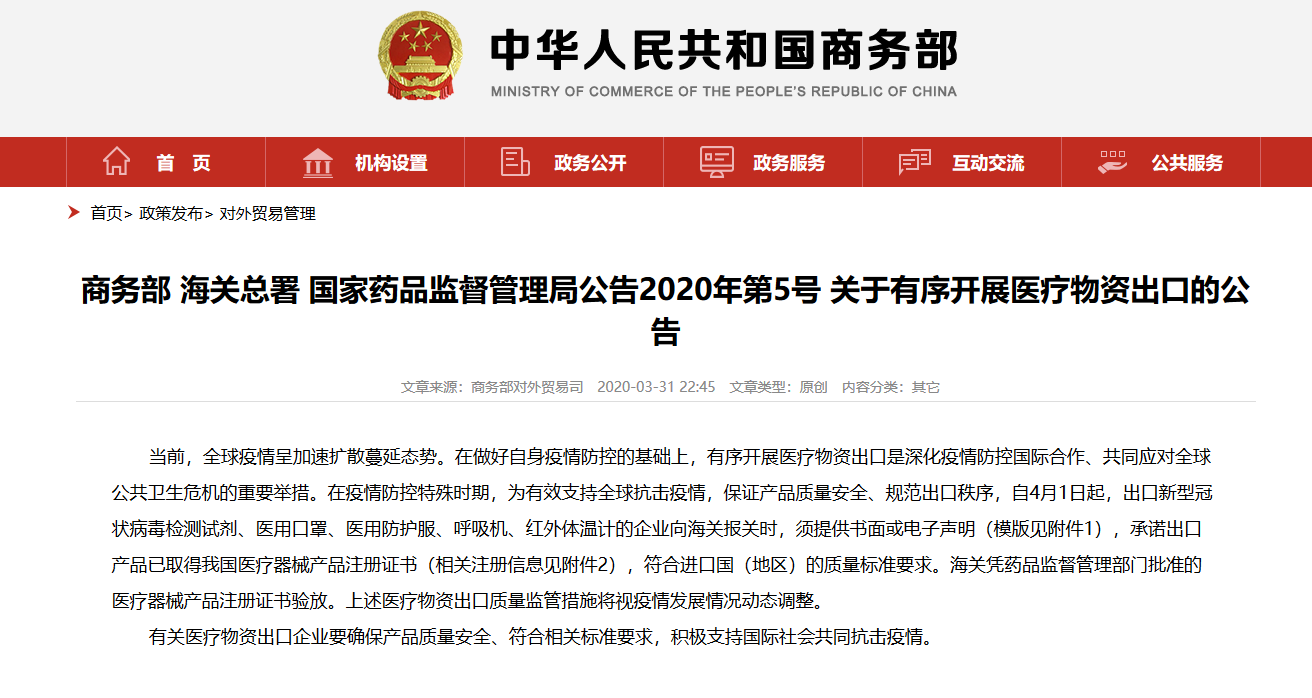 商務(wù)部、海關(guān)總署、藥監(jiān)聯(lián)合發(fā)布2020第5號(hào)公告,即日4月1日起執(zhí)行,新規(guī)對(duì)于我國出口醫(yī)療防疫物資將有新的管理標(biāo)準(zhǔn)要求。